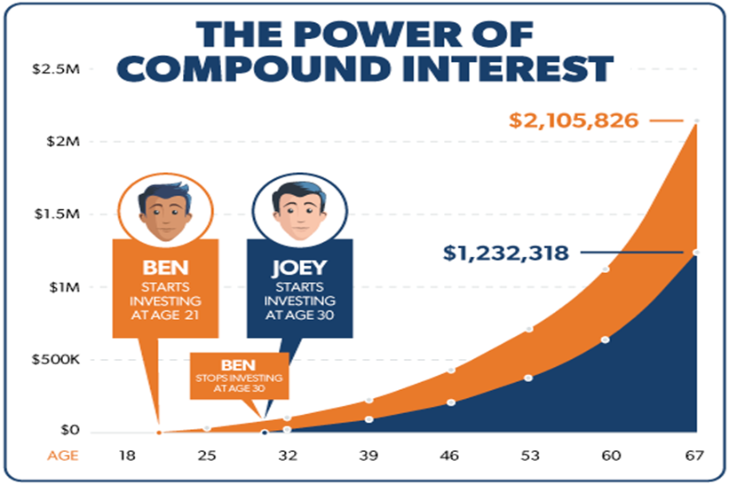 This is why you need to start saving and investing those savings as early as possible in your life. Time is a very important piece of the success of compound interest so you want to stay invested as long as possible. Investor fees can also impact the level of compounding returns.